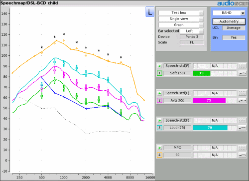 Cuando se utiliza en combinación con los nuevos objetivos DSL-BCD para dispositivos de conducción ósea integrados en Speechmap, puede verificar objetivamente que se proporcionen los niveles adecuados de audibilidad en las frecuencias para varios niveles de entrada de voz.